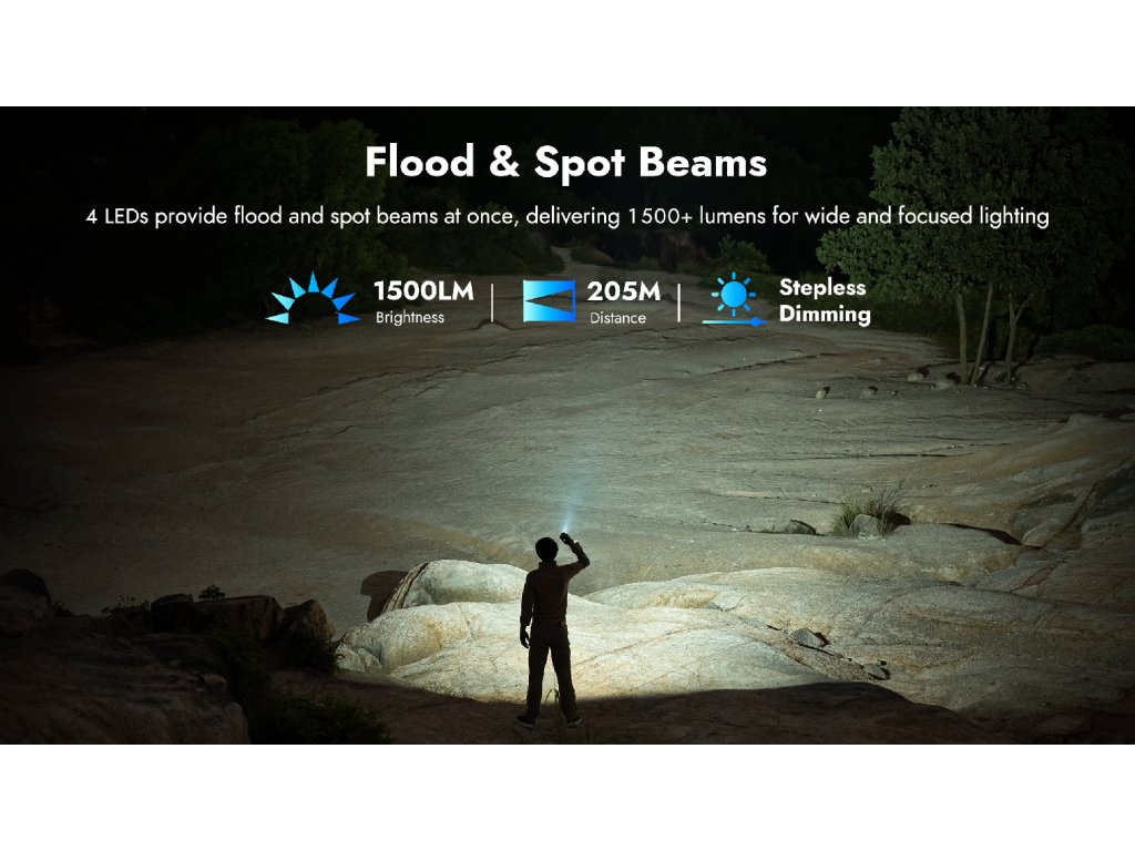4× automotive-grade 2016 LED (1 spot + 3 flood čipy, neutral white) poskytujú súčasne zameraný lúč na 205 metrov aj široké flood osvetlenie 1500 lúmenov bez potreby prepínať režimy. Real use case: Cyklisti pri nočnej jazde vidia detaily cesty (spot) aj okolie (flood). Technici pri práci pod autom osvietia motor aj pracovný priestor naraz. Turisti pri navigácii v teréne vidia cestu aj potenciálne prekážky na bokoch. Automotive-grade LED zaručujú konzistentný výkon bez blikania (PWM-free na vysokých režimoch).