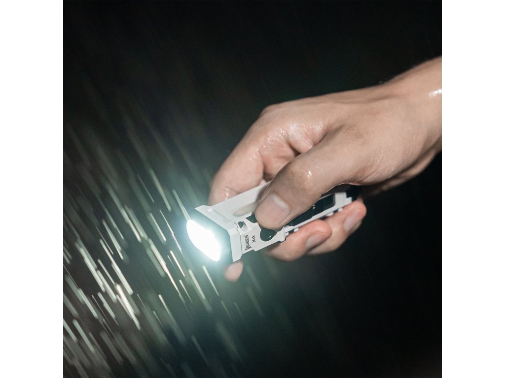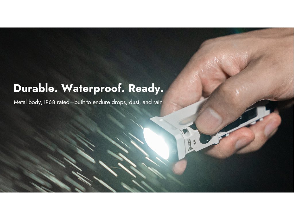 IP68 certifikácia (2 m pod vodou 60 minút) + drop resistance 1 m + kovové telo zaručujú, že X4 prežije to, čo by iné baterky neznesli. Použitie: silný dážď, snehové búrky, práca v mokrom prostredí, pád do vody, práca v prachu a bahne. Recenzent Christian Pahlitzsch: "Je to veľmi dobrá EDC baterka. Páči sa mi futuristický dizajn!"