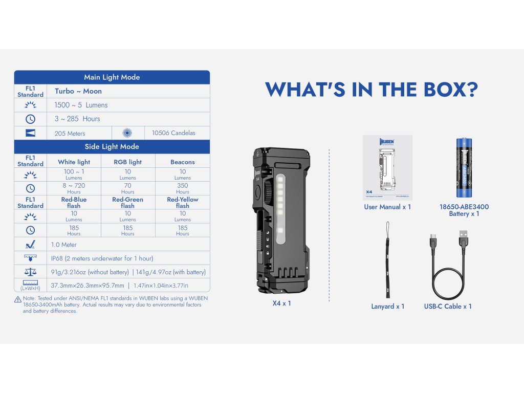 Poznámka k Turbo režimu: Výkon 1500 lúmenov trvá približne 1 minútu, potom automaticky klesá na ~465 lúmenov kvôli tepelnej ochrane (testované s Wuben 18650-3400mAh batériou v laboratóriu WUBEN podľa ANSI/NEMA FL1 štandardov). Toto je normálne správanie všetkých vysokovýkonných kompaktných bateriek – malé telo nemôže odvádzať toľko tepla ako väčšie modely.