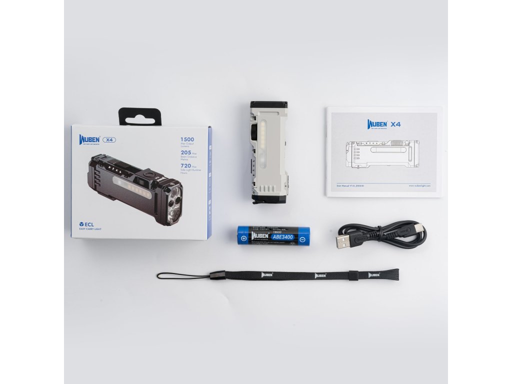 | Príslušenstvo v balení | Wuben X4 baterka, 18650 batéria ABE3400, USB-C kábel, clip, šnúrka (lanyard), manuál |