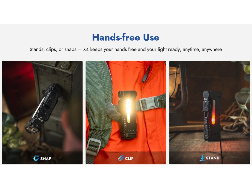Magnetický tailcap obsahuje silný neodymový magnet, ktorý prilepí X4 na kapotu auta, rám stanu, dielenskú skriňu, chladničku, kovový stĺpik bicykla. Clip (vrátane upgraded deep-carry verzie) umožňuje pripevnenie na opasok, batoh, vrecko košele. Stand-up dizajn – plochá spodná časť umožňuje postaviť baterku na stôl/zem ako stolnú lampu. Recenzent Lorenzo: "Veľmi kvalitné spracovanie. Môžem len odporučiť!"