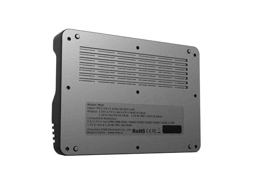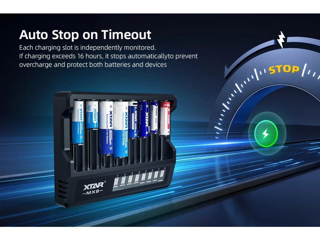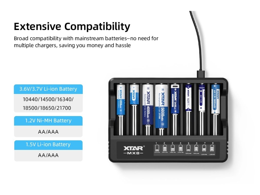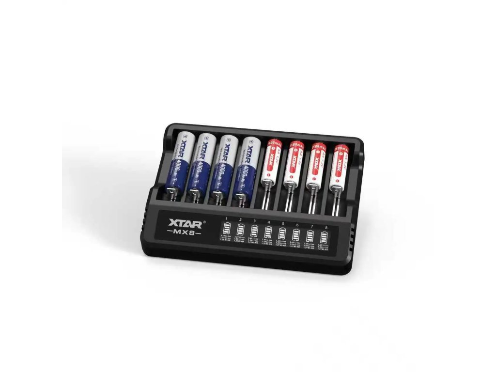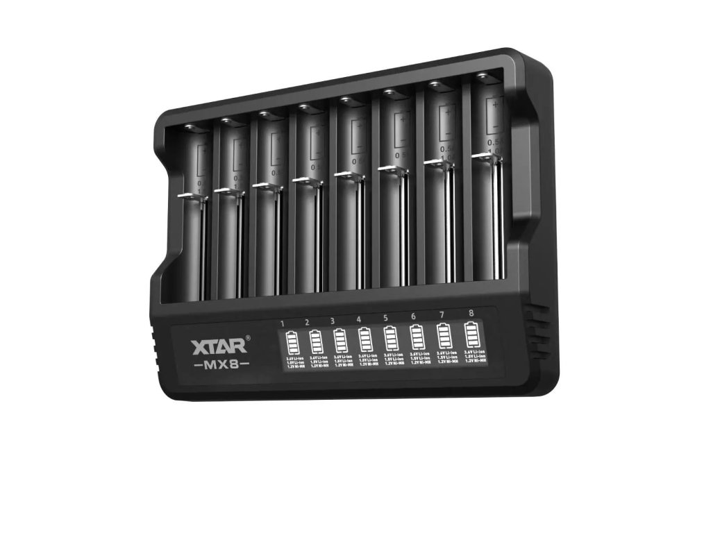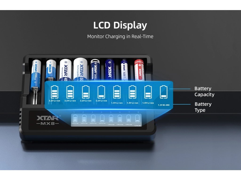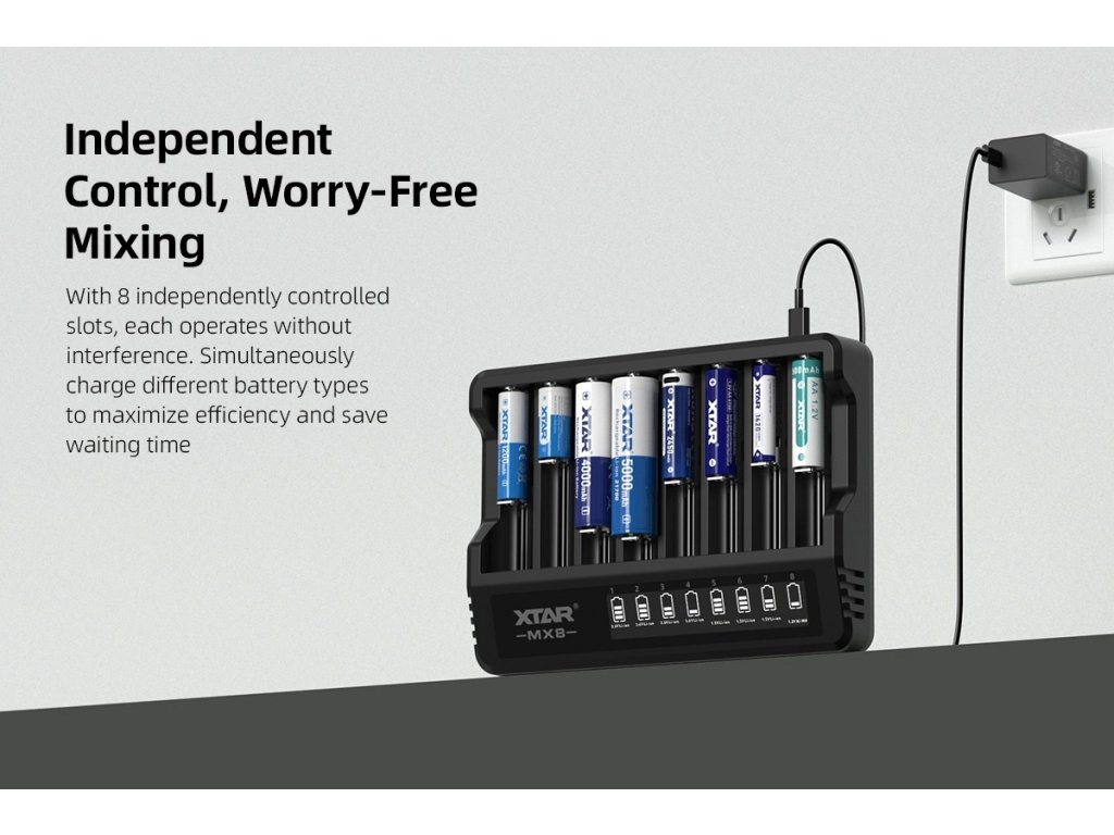 XTAR MX8 je revolučná nabíjacia stanica, ktorá dokáže súčasne nabíjať až 8 batérií rôznych typov a veľkostí. Vďaka integrovanej USB-C podpore pre Power Delivery a Quick Charge získate flexibilné riešenie pre domácnosť, dielňu aj outdoor aktivity. Každý z ôsmich slotov funguje nezávisle, čo znamená, že môžete nabíjať 3,6V Li-ion článok 18650 vedľa Ni-MH batérie AA – všetko súčasne, bezpečne a automaticky.