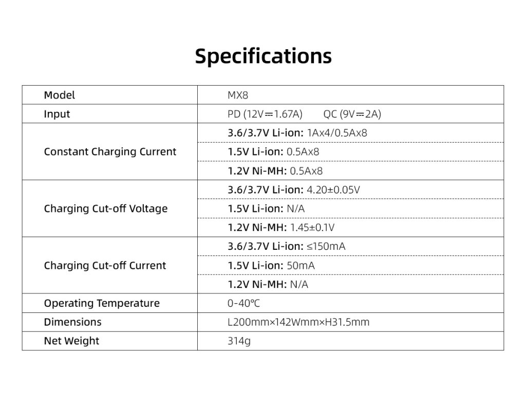 - Univerzálna multi-chemická podpora: MX8 je prvá nabíjačka svojho druhu, ktorá zvláda 3,6V/3,7V Li-ion (18650, 21700, 14500 a ďalšie), moderné 1,5V Li-ion AA/AAA batérie aj klasické 1,2V Ni-MH/Ni-CD články. Koniec s hŕbou špecializovaných nabíjačiek – jedno zariadenie pre všetky vaše potreby.