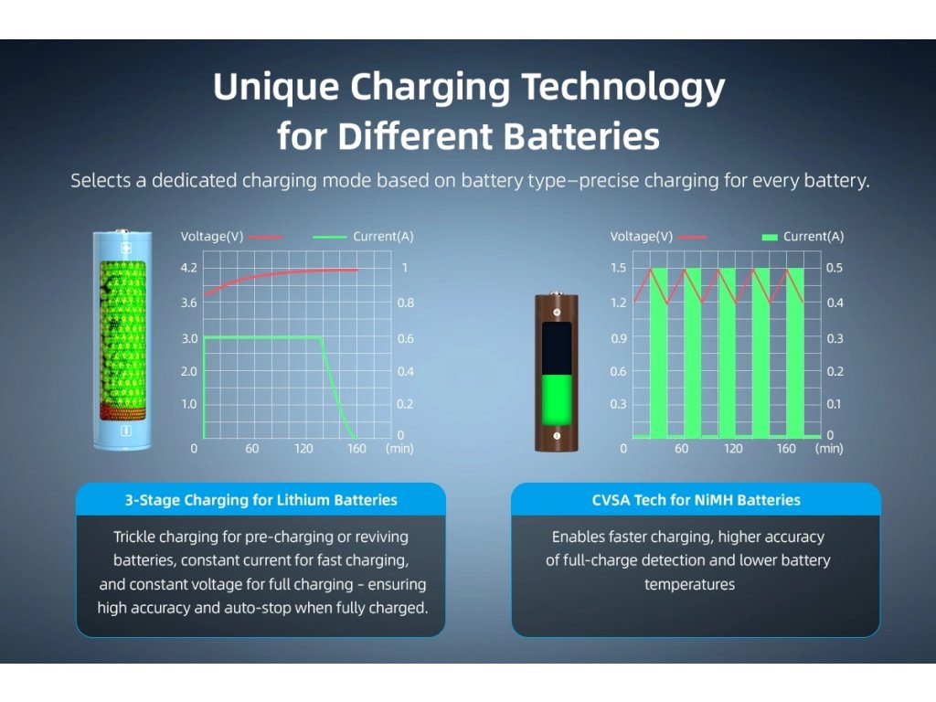 Odpoveď: CVSA (Continuous Voltage Step-down Analysis) je proprietárna technológia XTAR pre presné nabíjanie Ni-MH článkov. Na rozdiel od starších metód delta-V, ktoré musia batériu mierne prebiť, aby zistili pokles napätia signalizujúci plné nabitie, CVSA neustále analyzuje nabíjaciu krivku a ukončí proces presne pri 1,45V bez prebytočného zaťažovania. Výsledok? Chladnejšie nabíjanie, dlhšia životnosť batérií a vyššia presnosť detekcie plnej kapacity.