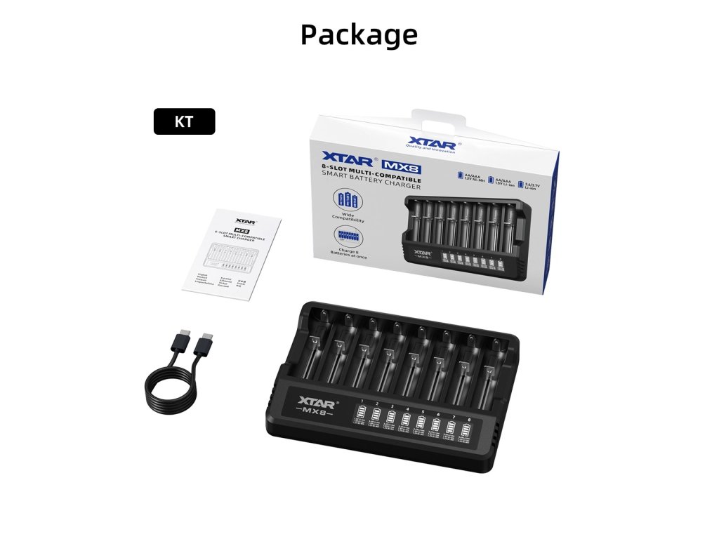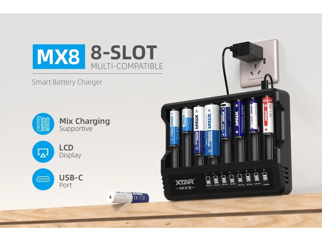 XTAR MX8 je revolučná nabíjacia stanica, ktorá dokáže súčasne nabíjať až 8 batérií rôznych typov a veľkostí. Vďaka integrovanej USB-C podpore pre Power Delivery a Quick Charge získate flexibilné riešenie pre domácnosť, dielňu aj outdoor aktivity. Každý z ôsmich slotov funguje nezávisle, čo znamená, že môžete nabíjať 3,6V Li-ion článok 18650 vedľa Ni-MH batérie AA – všetko súčasne, bezpečne a automaticky.