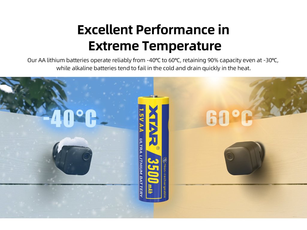 XTAR Ultra3500D je prémiová nedobíjateľná lítiová batéria AA formátu s kapacitou 3500mAh, využívajúca LiFeS2 (lithium iron disulfide) technológiu. Je špeciálne navrhnutá pre trail kamery (wildlife monitoring), outdoor zariadenia (GPS, meteorologické stanice), profesionálne audio vybavenie (Zoom rekordéry) a núdzové balíčky. Hlavné výhody sú extrémna teplotná odolnosť (-40°C až +60°C), 10-ročná skladovateľnosť, 100% bez vytečenia a 30% nižšia hmotnosť oproti alkalickým batériám. Ide o priamu konkurenciu Energizer Ultimate Lithium L91 za výhodnejšiu cenu.