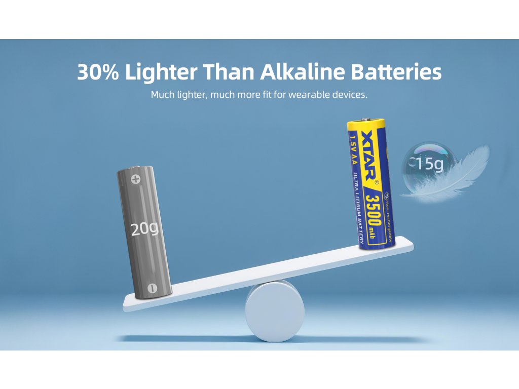 Ultra3500D váži len 15 gramov oproti alkalickým 23 gramom vďaka LiFeS2 (lithium iron disulfide) chémii, ktorá má vyššiu energetickú hustotu (280 Wh/kg vs 120 Wh/kg u alkalických). Lítium je najľahší kov v periodickej tabuľke, takže poskytuje viac energie pri menšej hmotnosti. To je obrovská výhoda pre prenosné zariadenia - GPS navigácie, čelovky, fitness trackery, profesionálne audio rekordéry, kde každý gram hmotnosti záleží. Pre porovnanie: 4× Ultra3500D = 60g, 4× alkalické = 92g. Rozdiel 32g sa zdá malý, ale pri celodennom nosení čelovky alebo GPS to cítiť.