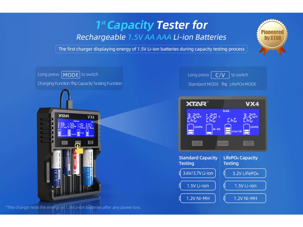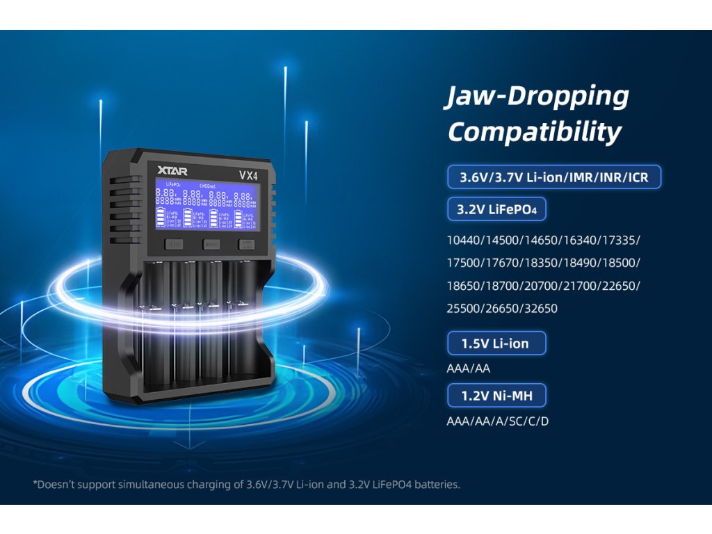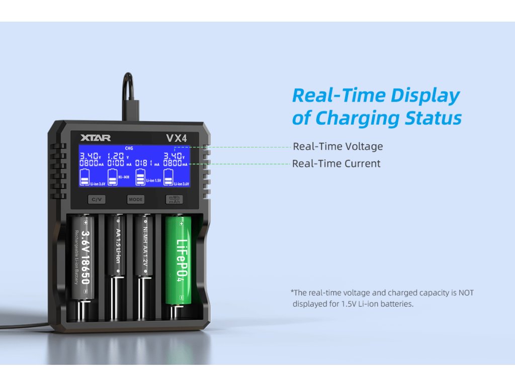 VX4 podporuje najširšiu škálu batériových typov na trhu: 3.6/3.7V Li-ion (10440, 14500, 16340, 18350, 18650, 18700, 20700, 21700, 26650, 32650), nabíjateľné 1.5V Li-ion (AAA, AA s jedinečnou schopnosťou testovania kapacity), 1.2V NiMH (AAA, AA, A, SC, C, D) a 3.2V LiFePO4 (všetky cylindrické veľkosti). Pre prepnutie medzi štandardným režimom a LiFePO4 režimom stačí dlhé stlačenie tlačidla C/V. Táto všestrannosť znamená, že namiesto niekoľkých špecializovaných nabíjačiek stačí jedno zariadenie pre všetky vaše potreby.