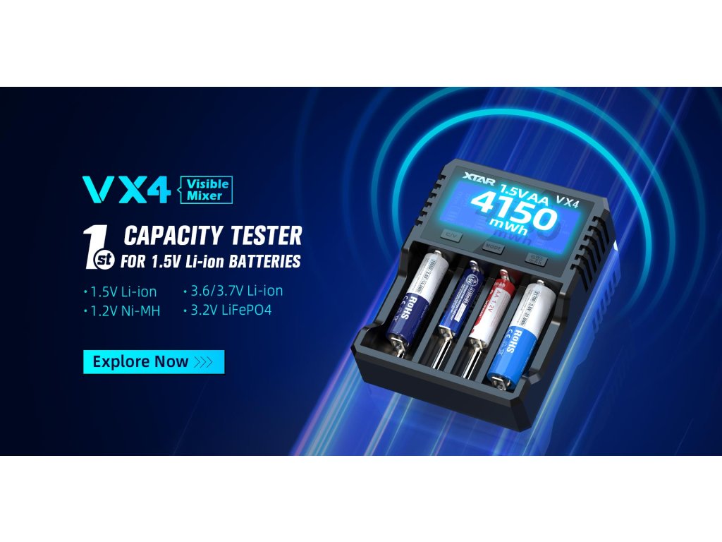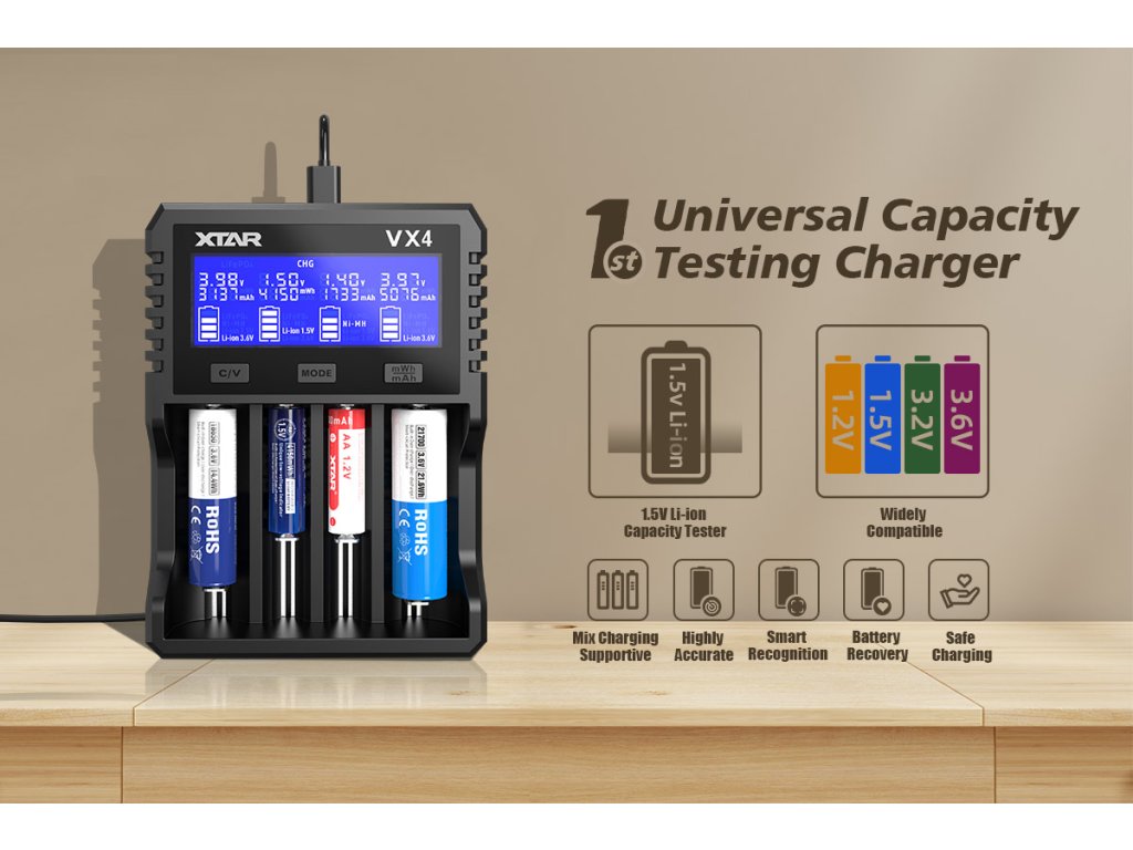 Náhrada alkalických batérií: Nabíjateľné 1.5V Li-ion batérie (XTAR, EBL, Hixon a ďalšie značky) nahrádzajú drahé alkalické jednorazovky v diaľkových ovládačoch, detských hračkách, hodinách a ďalších zariadeniach. VX4 SET je pripravený na okamžité použitie s najvyšším výkonom.