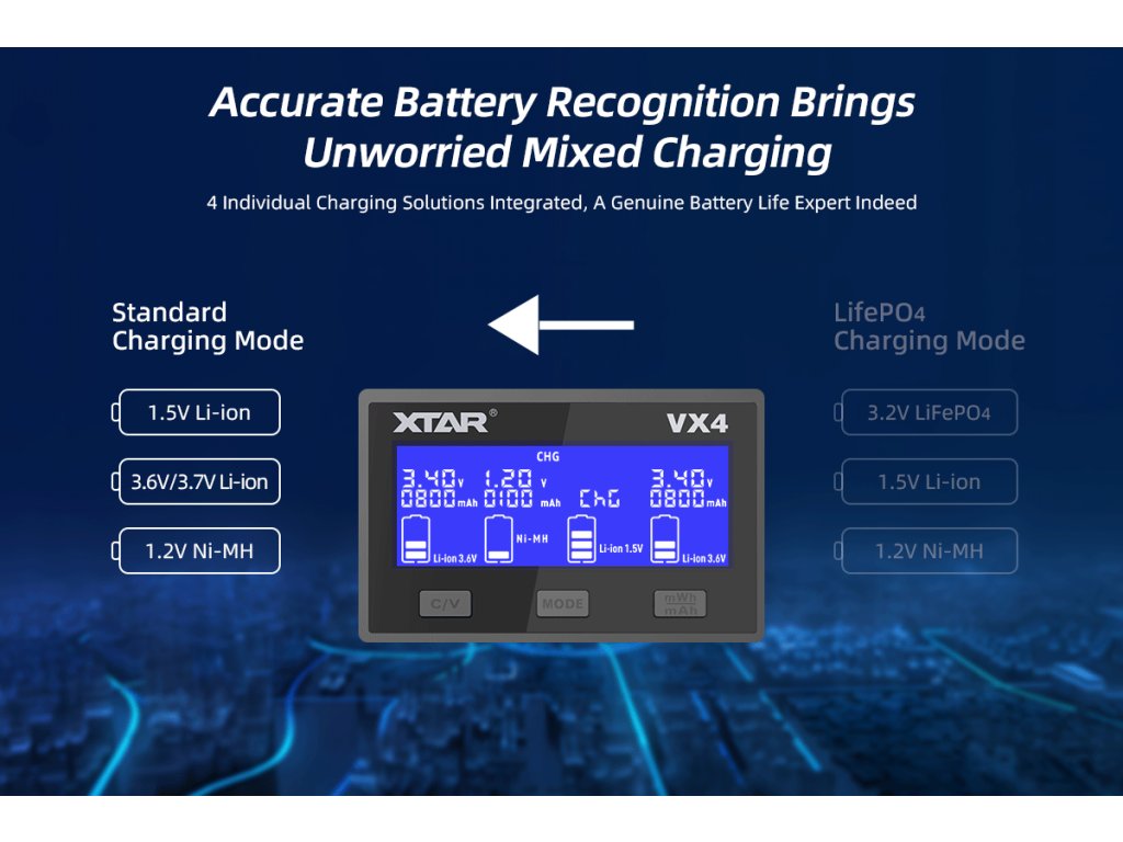 Unikátna vlastnosť VX4 je schopnosť mixovať rôzne chemické typy batérií v jednom nabíjacom cykle. Môžete súčasne nabíjať 18650 Li-ion vedľa AA NiMH vedľa LiFePO4 bez akýchkoľvek problémov - nabíjačka automaticky rozpozná každú batériu a prispôsobí parametre pre každý slot nezávisle. Jediná výnimka je, že nemôžete mixovať 3.6V Li-ion s 3.2V LiFePO4 (je potrebné prepnúť režim tlačidlom C/V). Táto flexibilita šetrí čas a eliminuje potrebu triediť batérie pred nabíjaním.