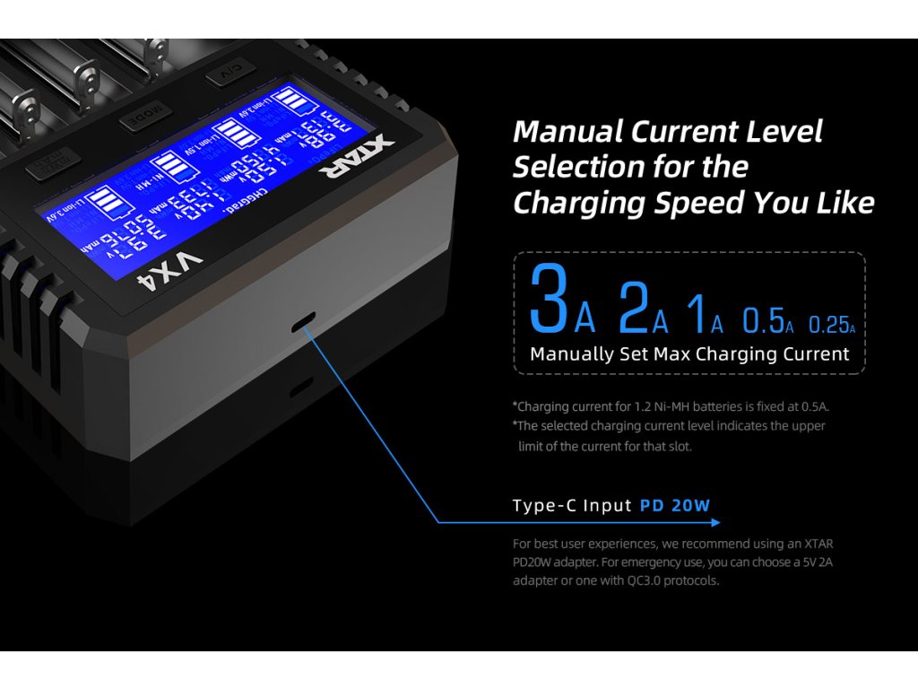 S priloženým XTAR PD20W adaptérom (12V/1.67A) dosiahnete maximálny nabíjací prúd 3A na jeden slot, 2A na dva sloty alebo 1A na štyri sloty. To znamená, že napríklad 26650 batériu s kapacitou 6000mAh nabijete za menej ako 3.3 hodiny namiesto 6+ hodín pri bežných 1A nabíjačkách. VX4 automaticky volí optimálny prúd na základe typu batérie, počtu slotov a vnútorného odporu batérie pre maximálnu bezpečnosť a životnosť.
